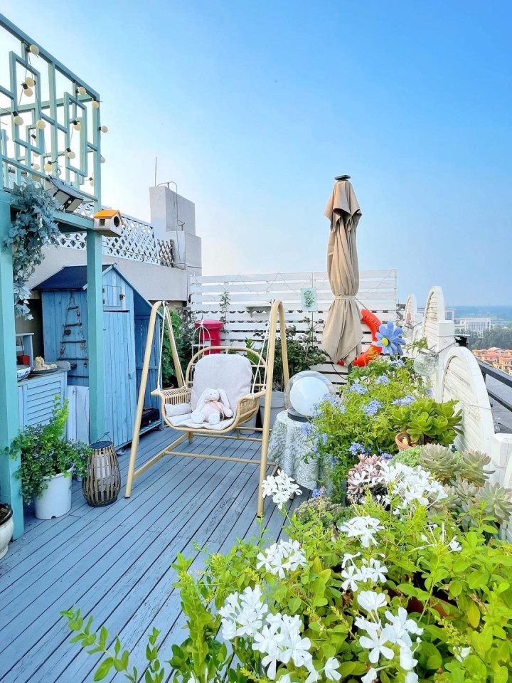 防腐木地板一铺,氛围立马不一样了,光脚踩上去温温润润的。靠墙角落搭了个小花架,月季、绣球、多肉慢慢爬满了架子,花开时节,那个热闹。