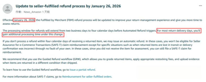 针对FBM订单,亚马逊将于2026年1月26日起执行更新后的退款处理政策。卖家处理退货退款的时限,将由原先的“收到退货后2个工作日内”,调整为“4个自然日内”,包含周末及法定节假日。