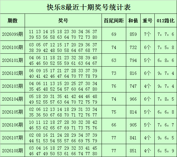 福彩快乐8第2026108期开奖回顾:03 04 16 18 27 29 32 33 41 45 46 47 49 50 53 61 66 74 77 80,其中奖号首尾间距为77,和值为851,012路比为6:5:9,包含7组同尾号码:50-80、41-61、03-33-53、04-74、16-46-66、27-47-77、29-49,开出4个重号:16、29、53、66。
