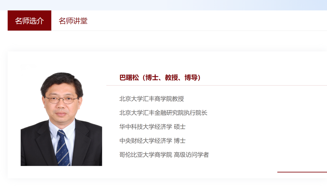 截至目前,北大汇丰商学院官网显示,巴曙松是北大汇丰商学院教授、北京大学汇丰金融研究院执行院长。